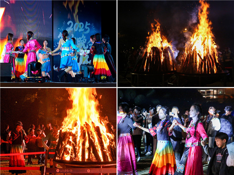 歌声轻扬,笑语盈空。《欧若拉》《当你》《铭记》……一首首耳熟能详的歌曲,由校园十佳歌手轮番唱响,全场随之共鸣,和着节拍热情跟唱。在一片欢歌笑语声中,点火仪式热闹开启,全场目光聚焦、齐声倒计时:“……3、2、1!”校长李旭锋与校党委书记林红共同执起火把,点燃主火堆。火苗“腾”地升起,瞬间欢呼如潮,其余四簇篝火相继燃亮,将锦江的夜晚映照得格外温暖。大家眼中满是激动与喜悦,人面“篝火”相映红,师生手挽着手,围着跃动的火焰跳起欢快的达体舞,朗朗笑声此起彼伏,暖意融融。