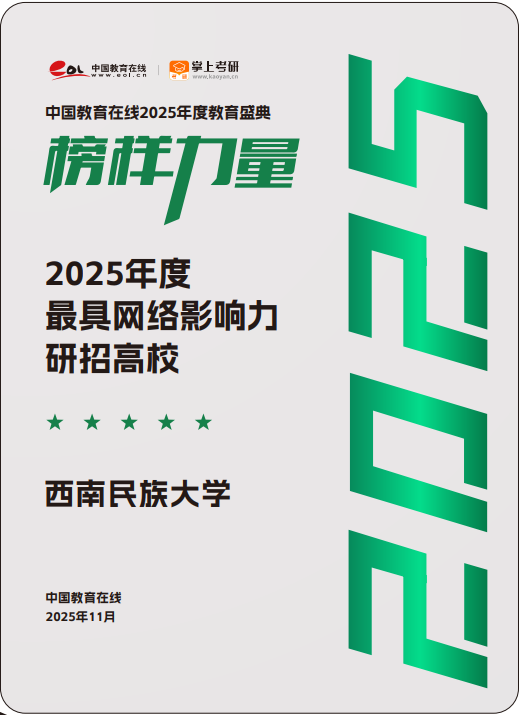 近日,中国教育在线“榜样力量·2025年度教育盛典”优秀案例名单公布。西南民族大学凭借极具创新性与前瞻性的招生宣传策略,以及扎实的宣传执行实力,从众多高校中突围,获评“2025年度最具网络影响力研招高校”。