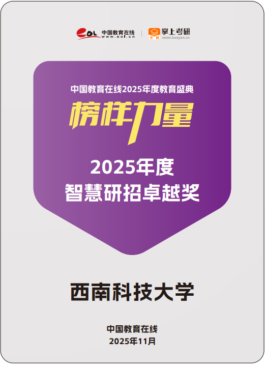 近日,中国教育在线“榜样力量·2025年度教育盛典”优秀案例名单公布。西南科技大学凭借极具创新性与前瞻性的招生宣传策略,以及扎实的宣传执行实力,从众多高校中突围,获评“2025年度智慧研招卓越高校”。
