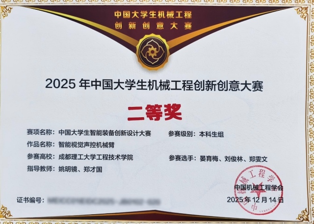 近日,2025年中国大学生机械工程创新创意大赛——中国大学生智能装备创新设计大赛全国总决赛在天津大学圆满落幕。成都理工大学工程技术学院由机器人工程专业学子组成的团队,凭借作品《智能视觉声控机械臂》,在来自全国175所高校的275支精英团队的激烈角逐中脱颖而出,斩获大赛二等奖,充分展现了学校学子扎实的专业素养与突出的创新实践能力。