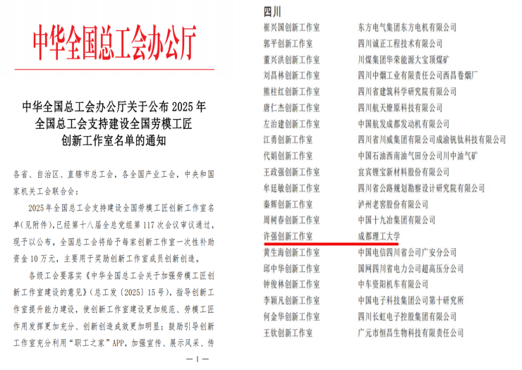 12月19日,全国总工会公布了2025年支持建设全国劳模工匠创新工作室名单,成都理工大学许强创新工作室成功入选,系四川省高校唯一,标志着成都理工大学创新工作室建设迈上新的台阶。