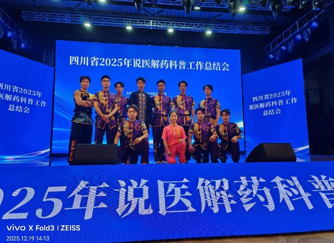 近日,成都体育学院武术套路代表队受邀参加四川省2025年“说医解药”科普工作总结会暨药膳大赛。武术套路代表队携原创集体刀术表演惊艳登台,以刚劲凌厉的刀术功夫融合中医药科普与药膳文化,用青春风采诠释“武医同源”“食药同源”智慧,赢得全场与会嘉宾的热烈掌声与高度赞誉。