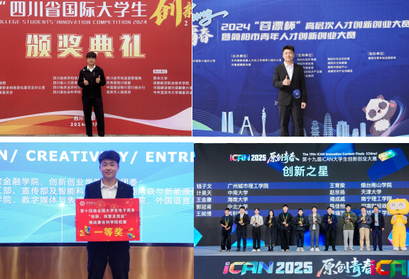 “志之所趋,无远弗届”,这是王闻博的竞赛信条,更是他深耕赛场的行动指南。在学校三创教育的沃土上,在指导老师的悉心助力下,他带着对专业的热爱与对创新的执着,奔赴一场场竞赛征程。从项目构思时的反复打磨,到方案完善时的精准攻坚,再到答辩现场的沉稳应变,每一个环节都凝聚着他的心血与坚持。他享受突破瓶颈的酣畅,更珍视团队协作的力量,带领团队在各类高水平竞赛中屡创佳绩:2024年“挑战杯”四川省大学生创业计划竞赛银奖、“建行杯”四川省国际大学生创新大赛2项银奖与3项铜奖,全国高校商业精英挑战赛国际贸易竞赛全国二等奖、第二十七届中国机器人及人工智能大赛全国总决赛三等奖,第十九届iCAN大学生创新创业大赛全国总决赛二等奖,更凭借突出表现获评2025年iCAN创新之星。