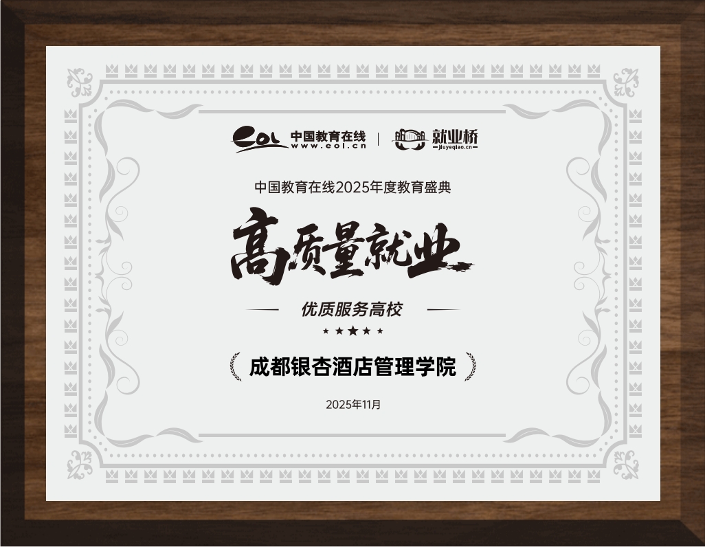 为深入贯彻党中央、国务院关于促进高校毕业生等青年就业创业的决策部署,落实《人力资源社会保障部 教育部 财政部关于做好2025年高校毕业生等青年就业工作的通知》等最新政策精神,挖掘和推广就业工作典型。中国教育在线·就业桥举办了“高质量就业”2025年度教育盛典活动,表彰高校就业工作数智化转型,创新实践的优秀案例,对推动高校就业跨越式发展,汇聚创新动力的榜样单位进行推广。成都银杏酒店管理学院荣获“2025高质量就业·优质服务高校”荣誉称号。