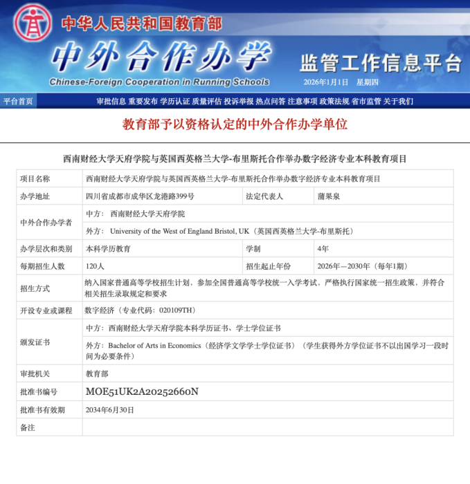在数字经济成为我国经济高质量发展核心引擎与“新质生产力”典型代表的宏观背景下,西南财经大学天府学院与英国西英格兰大学(UWE Bristol)合作举办数字经济专业本科教育项目获教育部正式批准(批准书编号:MOE51UK2A20252660N)。