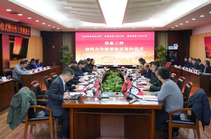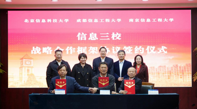 北京信息科技大学党校办、教务处、发展战略与规划处、产教融合办公室、对外合作联络办、校友办、信息与通信工程学院,南京信息工程大学党委办公室、校长办公室、发展规划处、教务处主要负责人,成都信息工程大学相关职能部门与学院主要负责人参加签约仪式。