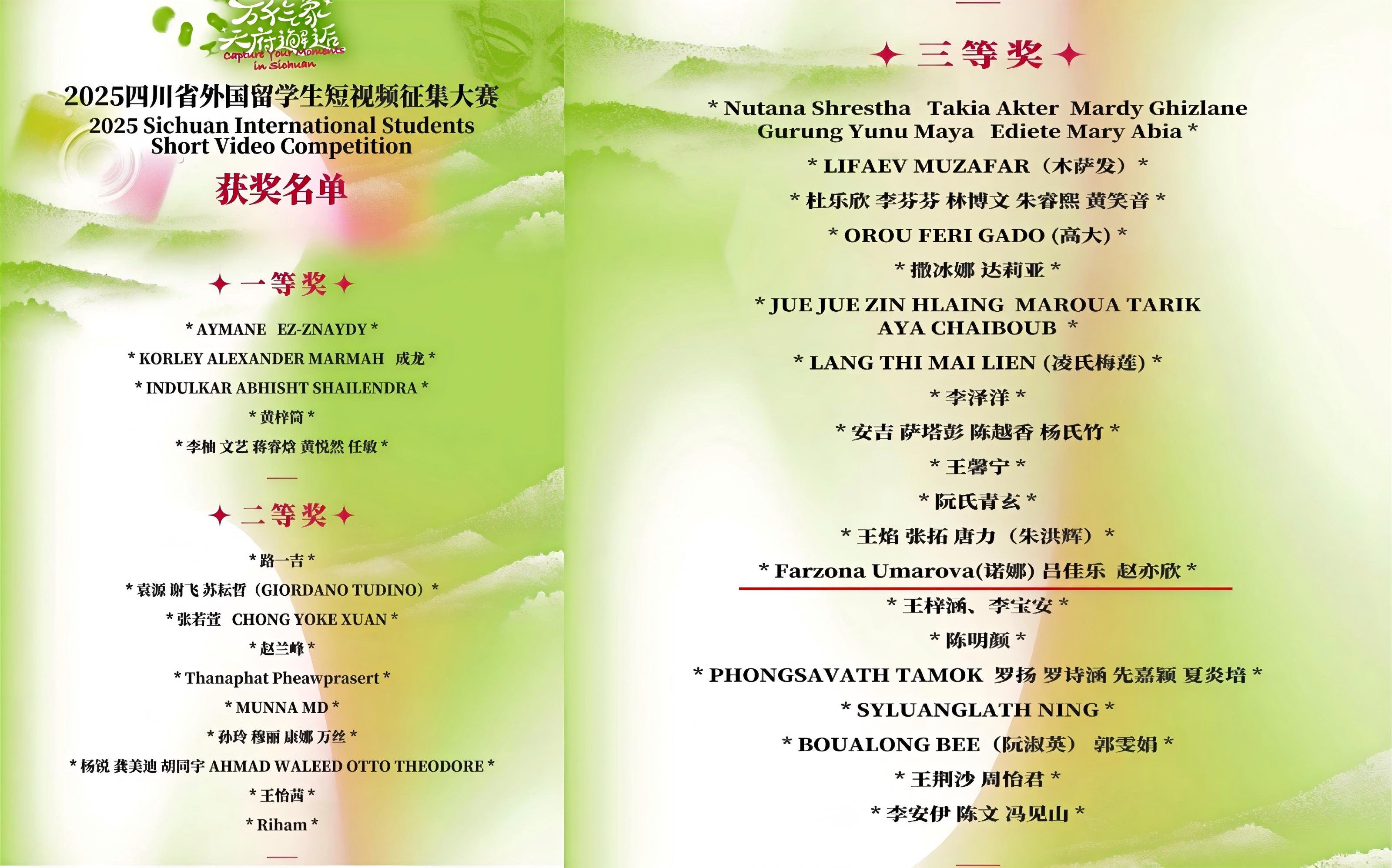 此次获奖,既是对三位同学专业能力与创新实践的充分肯定,也彰显了学校在实践教学、文化育人、国际交流与国际传播方面的扎实成效。学校将以此为契机,继续搭建中外学生交流平台,引导青年学子深耕地方文化、讲好中国故事,为传播四川声音、促进中外文化互鉴贡献青春力量。