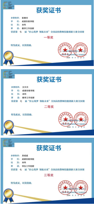近日,第七届“匠心筑梦 领航未来”全国高校教师技能创新大赛全国赛圆满落幕。在全国687所高校、2000余名优秀教师的激烈角逐中,成都东软学院信息与商务管理学院教师团队凭借扎实的专业功底、前沿的数智化教学实践与卓越的育人创新能力脱颖而出,斩获一等奖1项、二等奖1项、三等奖1项,用硬核实力在全国性教学赛事舞台上展现了学校师资队伍的过硬水平。