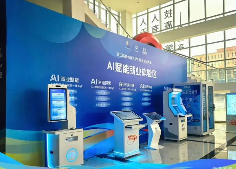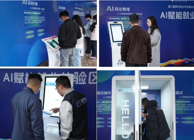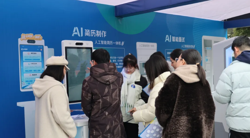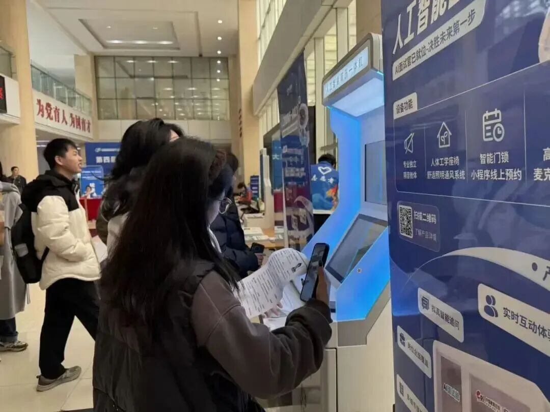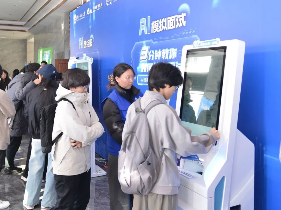 本次就业桥设立的体验区,围绕生涯探索、简历诊断、就业咨询、面试实战四大核心模块,部署了多款智能化服务一体机,将抽象的人工智能技术转化为师生可触摸、可体验、可应用的实用工具,为大赛注入浓厚的科技气息。