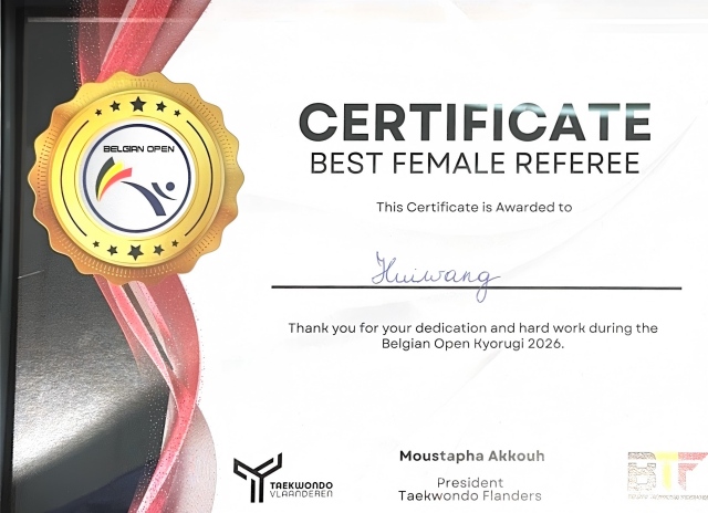 最近,吉利学院体育与健康学院王慧老师,在2026比利时国际跆拳道公开赛上,拿下“最佳女裁判”。