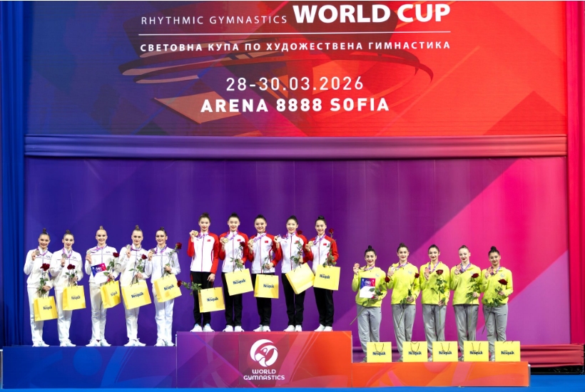 2026赛季国际体联艺术体操世界杯索菲亚站北京时间3月31日凌晨落幕,中国艺术体操队新赛季首秀迎来开门红,勇夺集体项目5球单项金牌。成都体育学院学子蒲彦竹、张馨艺作为集体项目主力队员,与队友们一同在国际赛场上展现了出色的竞技水平与顽强拼搏精神,为学校和祖国赢得了荣誉。