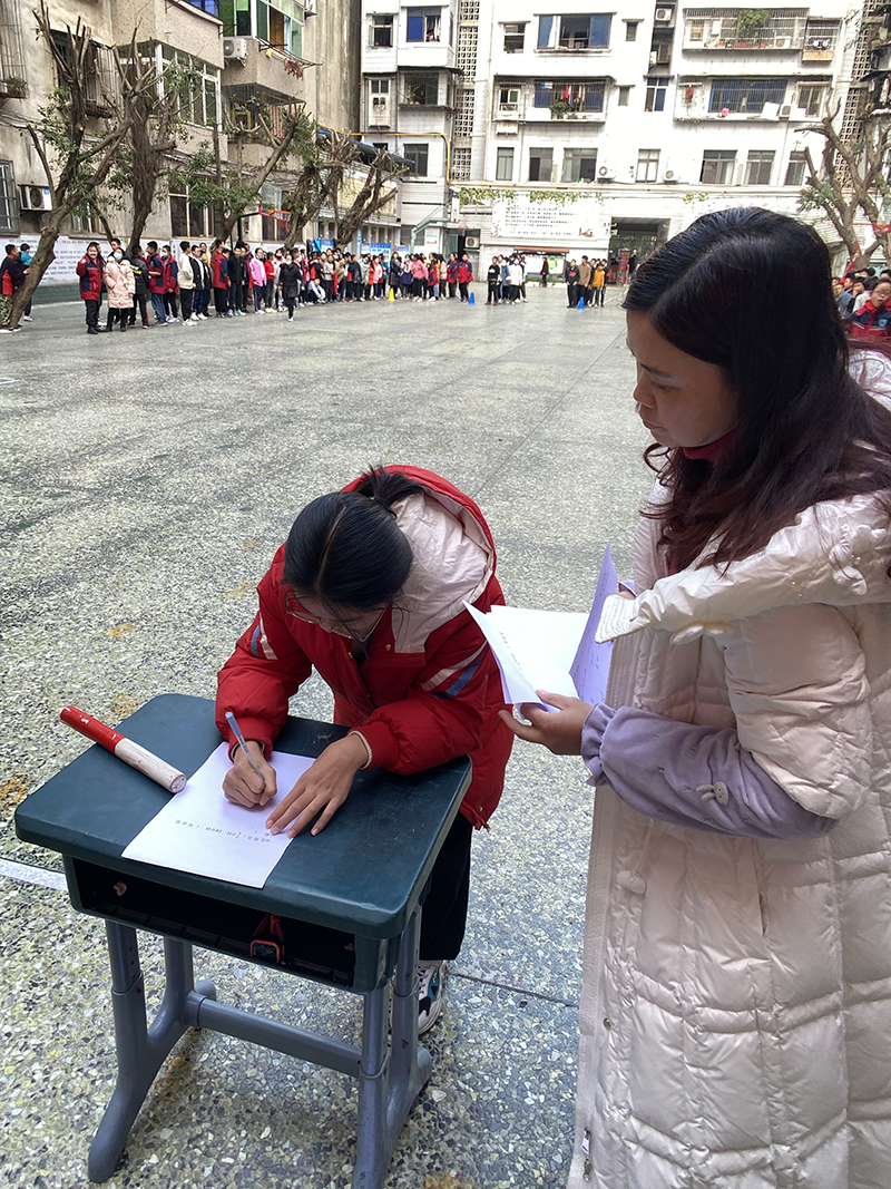 在全体学生欢呼声中,活动正式开始。各班选出男女各10人、亲友团3人参加,用50米接力形式,各班选用相同的20道题,选手通过50米短跑,在终点做题,正确后才能回跑,将接力棒传给下一个,如有困难,10秒后可求助亲友团,用时最少者获胜。
