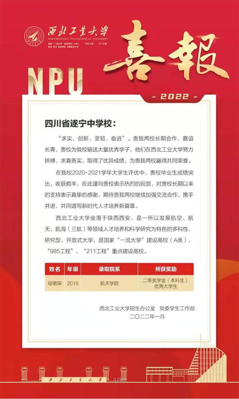 近日,南开大学、西北工业大学、吉林大学等知名高校陆续向遂宁中学发去喜报、贺信,祝贺遂宁中学学子在各高校中表现优异、求真务实、屡获嘉奖,展现了遂中学子勤勉好学、努力奋进的精神面貌。