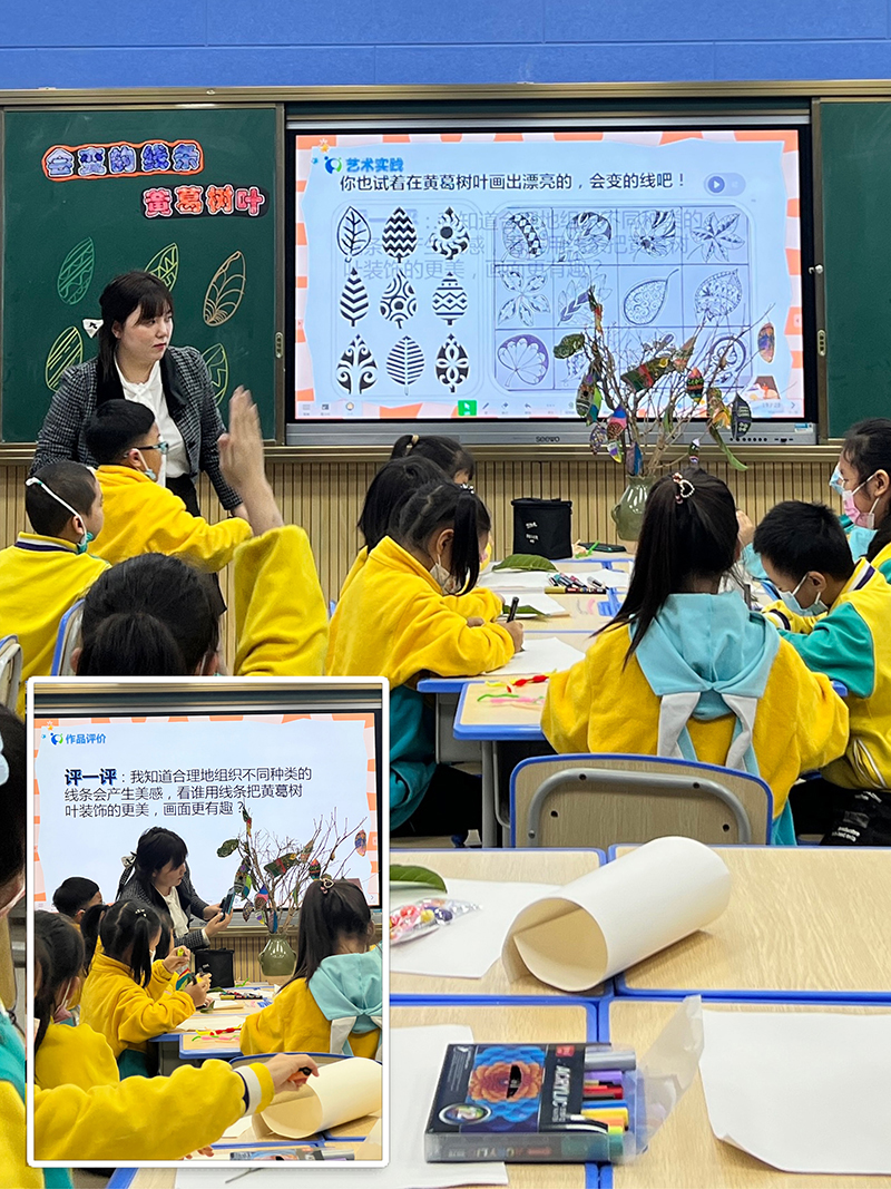邓艳老师执教的人美版二年级上册《会变的线条》,采用了游戏体验、情景教学、探究合作等形式。让学生们在游戏中感知线条,在玩耍中学会组合线条,最终学会运用不一样的线条装饰叶子。整个教学过程从让学生找线,找教室里的线条和他们衣服上的线条,找课件中展中建筑物线条、动物身上的线条。不但发展了学生的感知思维能力,还让学生了解线条无处不在,它和我们的生活紧密联系在一起,线条还能美化我们的生活,使学生领悟美术表现的多样性,以及在实际生活中的独特价值。这种富有情趣的美术教学更能够发挥学生的想象能力和培养丰富的创造力。