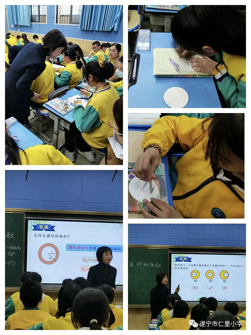 胡婷执教的是六年级上册《圆环的面积》。胡老师从学生掌握的常识和熟悉的事物入手,在教学过程中始终以学生的亲身实践贯穿始终,同时渗透一些方法,如动手操作、合作交流、观察、分析等,使学生在学习中运用、在运用中掌握,顺利推导出环形面积计算公式,发展了学生的空间观念。