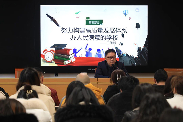 学校党支部书记、校长王代彬传达了2023年全国教育工作会议和遂宁市教体事业高质量发展工作会暨2023年春季学期开学工作会精神,并以《努力构建高质量发展体系 办人民满意的学校》为题作开学工作部署。在讲话中,王校长回顾了学校2022年学校各种工作取得的成绩和存在的不足,部署了2023年重点工作。他指出,2023年,大家要抓住“质量立校”这个关键词,紧紧围绕深入学习贯彻党的二十大精神这条主线,持续推进事关教师队伍提升的学习型集体建设,持续推进事关学科核心素养培养的有效课堂教学模式建构研究,持续推进旨在丰富课后服务课程供给的“三院”(若水书院、未来学院、艺体学院)有序运行,以主动担当、终身学习、热爱生活、志在卓越的工作态度和工作作风,努力构建高质量发展体系,办人民满意的学校。