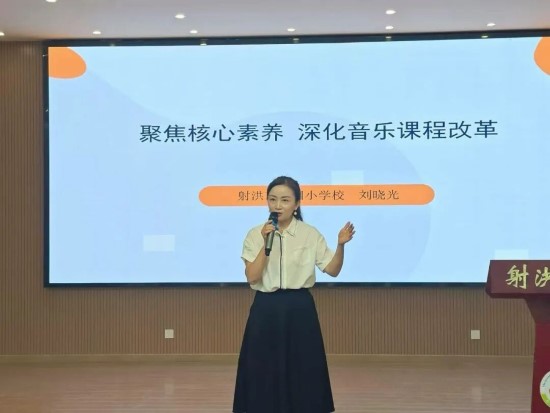 射洪市音乐教研员、名师工作室顾问、遂宁市名教师工作室领衔人刘晓光老师以《聚焦核心素养 深化音乐课程改革》为题开展专题讲座。她从核心素养出发,系统梳理了新教材的编写思路、结构特点与内容变化,引导教师从“教教材”转向“用教材教”。