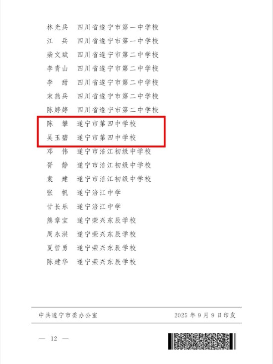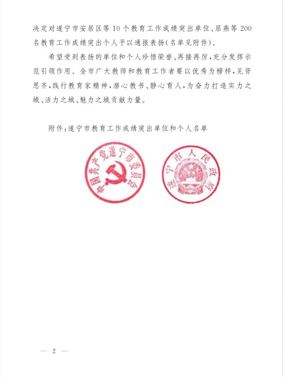 陈攀老师和吴玉碧老师被中共遂宁市委、遂宁市人民政府评为遂宁市教育工作成绩突出个人。