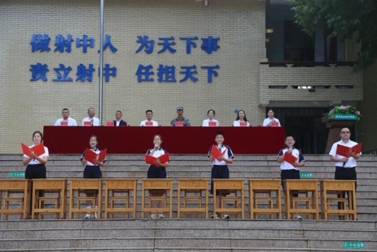 “与九三阅兵同频共振,与先辈遗志隔空回响。”师生深情朗诵壮丽诗篇,以青春的名义宣示复兴路上吾辈步履铿锵!朗诵之间,操场上依次展开“纪律”“团结”“意志”“自强”4大主题词,鲜艳的布幅,夺目的文字,彰显射中学子立志成为祖国栋梁的使命与担当。