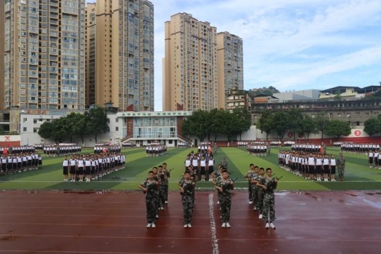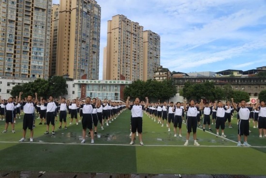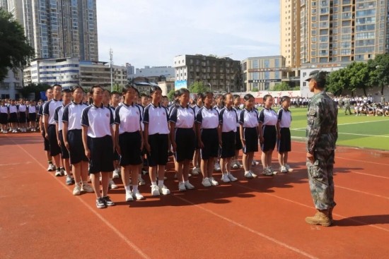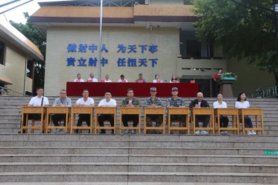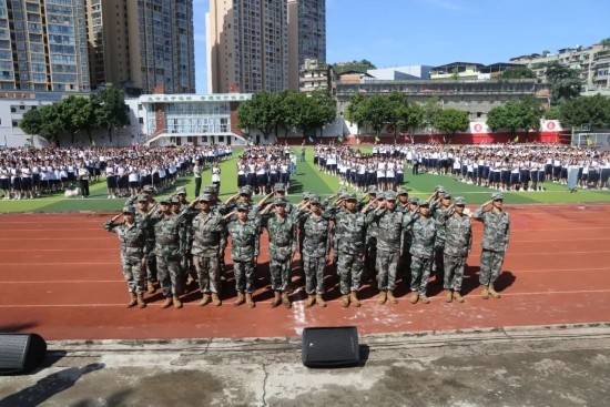 2025年9月19日上午9时,射洪中学初2025级行为习惯养成训练营结营仪式在广寒运动场隆重举行。学校行政领导、初一年级师生、训练教官及家长代表共同见证了这一庄严而富有意义的时刻。