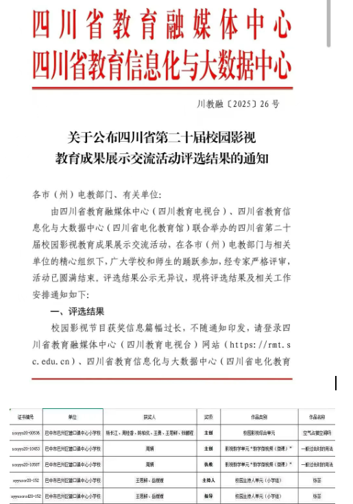 在四川省第二十届校园影视教育成果展示交流评选活动中,巴中市巴州区曾口镇中心小学校师生凭借优异表现荣获多项省级奖项。该校陈柏伉、杨长江、王勇、周桂香、王思鲜、张鹏程等教师联合创作的科教影视作品《空气占据空间吗》,周娟教师执教的英语微课《一般过去时的用法》,以及由王思鲜、岳媛媛教师指导的校园主持人项目,均在此次评选中获得省级表彰。