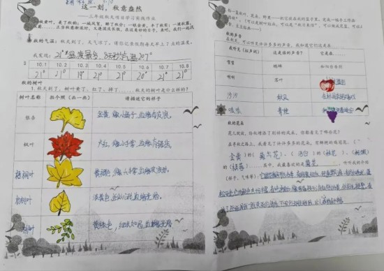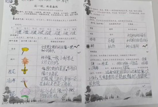 当三年级的实践作业遇上烂漫秋日,便成了一场充满惊喜的探索之旅。孩子们以最认真的姿态,在秋的气温里找规律,于秋叶间辨形态,在秋声中识万物,在秋花里赏芬芳……每一项记录、每一处描摹,都是他们与秋天对话的生动注脚,把秋的韵味、秋的细节,细细地藏进了作业的字里行间与画纸角落,让这份实践作业成了秋日里最鲜活的成长印记。