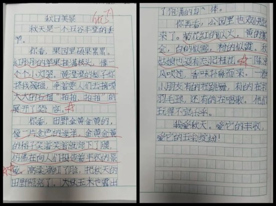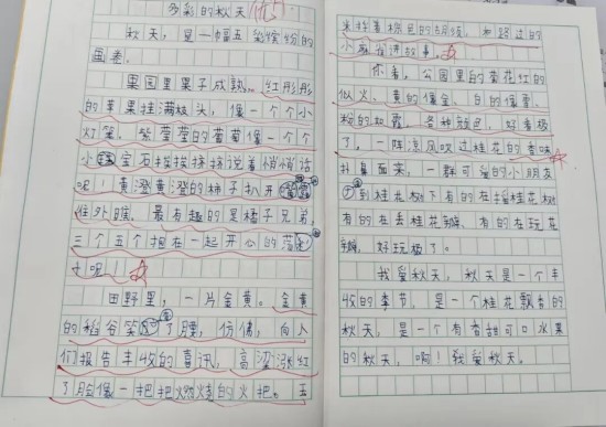 写秋天的作文时,孩子们的笔尖满是童真:“我捡的银杏叶像奶奶的蒲扇,摸起来滑溜溜的,阳光晒过还带着香味”“苹果园里的果子红得像小脸蛋,咬一口甜滋滋的,这是秋天的味道”“树叶粘贴画做了一下午,虽然手粘粘的,但看着自己的作品,觉得秋天真可爱”。没有华丽的辞藻,却把亲身感受到的秋意写得真切又动人。