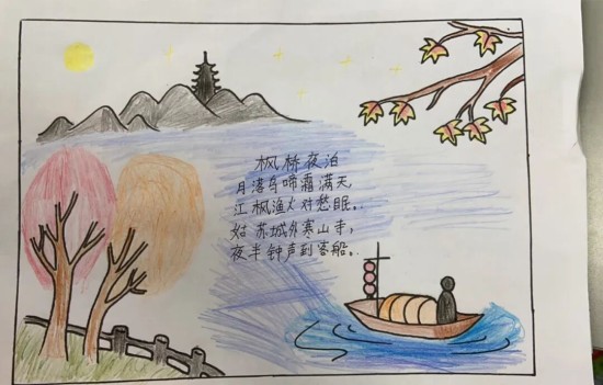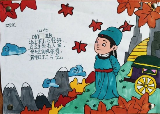 以秋为题,用画笔还原古诗意境,每一幅都藏着满满的巧思,画里有“霜叶红于二月花”的火红枫林,叶脉清晰、层林尽染;有“桂子月中落”的清雅桂树,细碎花瓣飘洒,满是暗香;还有“秋水共长天一色”的澄澈秋景,蓝天映碧水,芦苇随风摇。稚嫩笔触搭配经典古诗,让秋日古韵在画纸上流转,这就是孩子眼里最美的诗与远方!