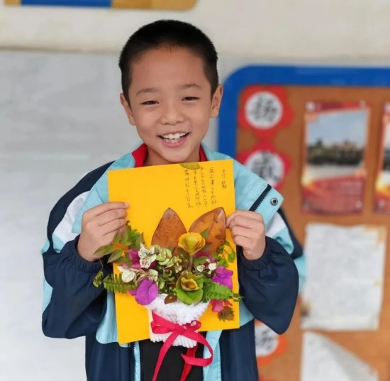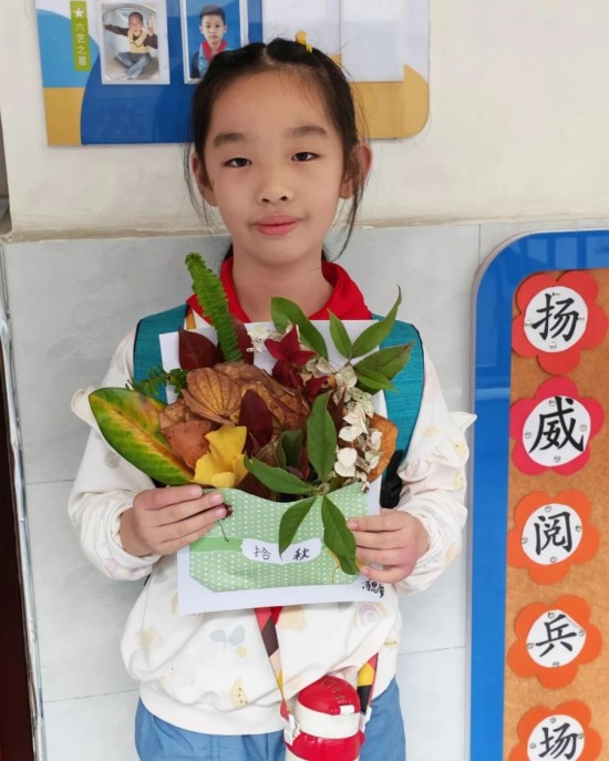 在秋日的小路上,同学们把自然的馈赠变成了艺术惊喜!亲手创作的花艺贴画,把五颜六色的秋花、绿草“装”进手绘的篮子里,每一朵花、每一片叶都是在秋日里采摘的快乐,每一处细节都是童心与秋意的浪漫碰撞。还有的组队合作,用大片的梧桐叶铺成“稻田”,小柳叶做“稻穗”,冬青叶剪圆当“果实”,活生生一幅“丰收图”,创意值拉满!