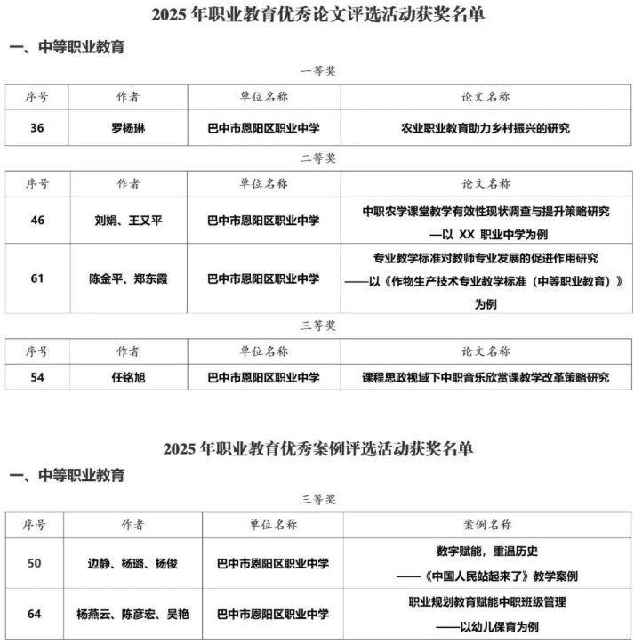 近日,巴中市恩阳职中(综合高中)师生接连在教学教研赛事、数字素养及科幻文学与绘画赛中收获诸多奖项。