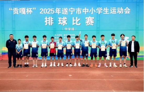 ▶沱牌实验学校在“贡嘎杯”2025年遂宁市中小学生运动会排球比赛中斩获初中男子组亚军。