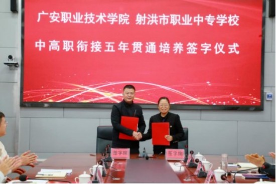 ▶近日,市职中与广安职业技术学院签订中高职衔接五年贯通培养协议。