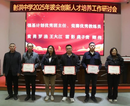 郭海兵宣读《四川省射洪中学校关于表彰2024—2025学年度强基计划与奥赛培训优秀集体及优秀教练员的决定》,5名学科竞赛优秀教练员、3个强基计划优秀班级受到表彰。学校党委书记文清泉为受表彰的个人颁奖。