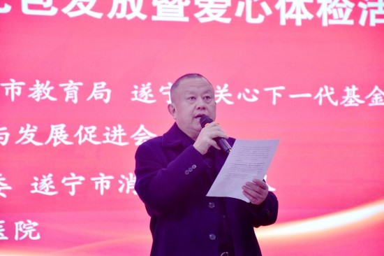 蒋海斌在讲话中强调,中小学生是祖国的未来和民族的希望。他指出,当前交通安全、溺水事故、不规范用电用火等安全隐患时有发生,严重威胁青少年生命健康;同时,视力、听力、脊柱发育等问题日益凸显,“小眼镜、小胖墩、小豆芽”现象普遍,健康隐患与意识缺失制约着青少年的全面发展。此次活动的开展,正是为进一步加强农村寄宿制学校消防安全教育,提升师生消防安全意识和自救能力,为孩子们的身心健康保驾护航,擦亮遂宁“爱心之都”的城市名片,营造安全、健康的成长环境。同时,他寄语同学们常怀感恩之心,铭记社会各界的关爱,将关爱转化为自强不息的动力,努力成长为不负自己、不负家庭、不负国家的栋梁之材。