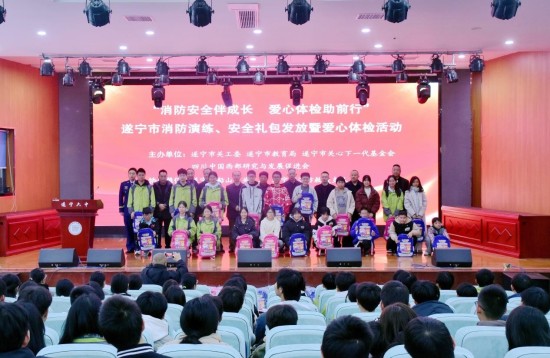 初冬的遂宁六中演艺厅内,暖流涌动、温情满溢。11月22日,由遂宁市关工委、市教育局、市关心下一代基金会、四川中国西部研究与发展促进会主办,船山区关工委、市消防救援支队、遂宁九九健康体检医院协办的“消防安全伴成长 爱心体检助前行”遂宁市消防演练、安全礼包发放暨爱心体检活动在此举行。活动通过赠送消防安全爱心礼包、消防知识宣讲、应急演练、免费体检等方式,为留守学生送上了集安全保障、健康关怀于一体的“暖心大礼”。
