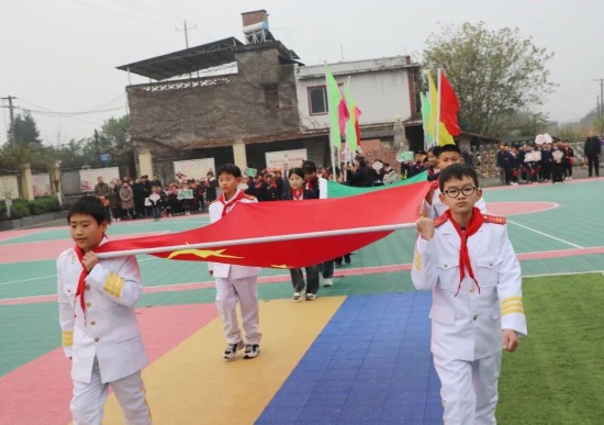 伴随着激昂的运动员进行曲,开幕式的入场环节正式开启。国旗队的队员们昂首挺胸,护卫着鲜艳的五星红旗率先入场,鲜红的旗帜在风中猎猎作响,彰显着庄严与神圣;紧随其后的校旗队,校旗在阳光下熠熠生辉,承载着永盛小学的精神与荣光;彩旗队的队员们手持五彩旗帜,步伐整齐,五彩的旗海翻涌,如流动的彩虹装点着赛场;裁判员方队身姿挺拔,神情严肃,展现出公平公正的执裁态度;各班级方队依次入场,孩子们迈着稚嫩却坚定的步伐,喊着响亮的口号,各具特色的班级展示,尽显少年朝气与班级风采。