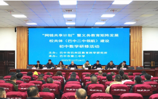 12月24日,由巴中市巴州区教育科学研究所主办的“网链共享计划”暨义务教育矩阵发展校共同体(巴中二中领航)初中数学研修活动在巴中二中圆满落幕。本次活动以“链动资源,共享教育新生态;阵结合力,绘制教育新图景”为指引,依托“四川省网链共享计划”平台,面向25所联盟网点校及共同体成员校进行实时直播,全区百余名初中数学教师及600多名七年级学生在线共同参与,实现了优质教育资源的广泛共享与专业智慧的深度聚合。