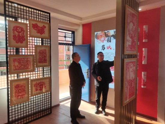 在校长唐田坤及学校领导班子的陪同下,洪定华局长一行率先走进学校特色剪纸艺术工坊。红纸翻飞间,一幅幅精美的剪纸作品或灵动鲜活、或古韵盎然,既有传统纹样的雅致,亦有校园生活的童趣。唐校长以非遗“胡氏剪纸”为切入点,详细汇报了学校“活力教育”理念下的特色办学实践——如何将传统文化与美育课程深度融合,通过剪纸工坊、课后服务等载体,让学生在动手实践中传承非遗文化,涵养品格,践行“六年温暖一生”的育人誓言。