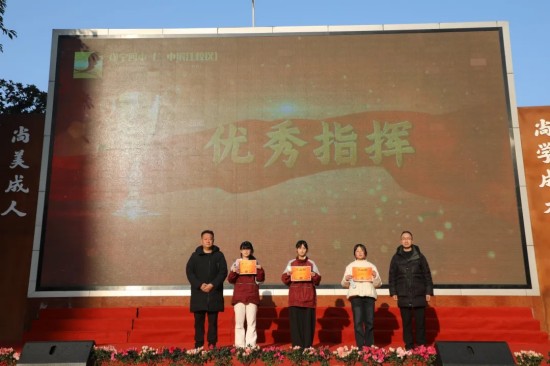 ▲党总支委员、副校长李攀华和尤艇为优秀指挥颁奖