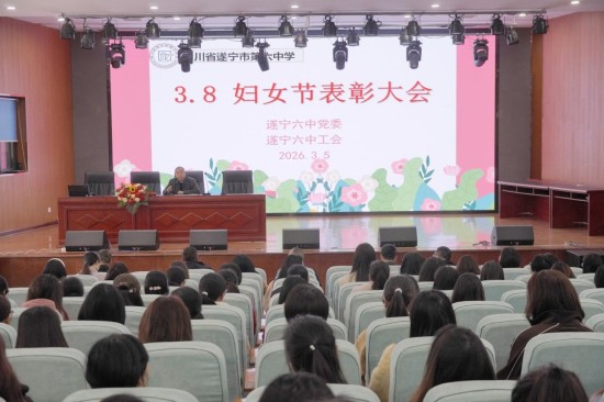 阳春三月,春风送暖。在第116个“三八”国际劳动妇女节来临之际,为礼赞巾帼风采,凝聚奋进力量,3月5日上午,遂宁六中举行2026年“三八”国际劳动妇女节表彰大会,向辛勤耕耘在教育一线的女教职工致以节日问候,并对涌现出的先进典型进行表彰。