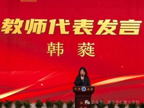 教师代表韩蕤承诺新学期将潜心教学、用心育人。她寄语同学们要自信自强、珍惜时光、脚踏实地,在不断超越自我中成长。祝愿全体师生携手奋进,共谱校园新篇章。