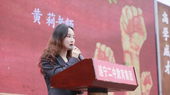 初三教师代表黄莉老师发言,承诺全程相伴、全力护航,做学子最坚实的后盾,与同学们并肩作战、披荆斩棘。