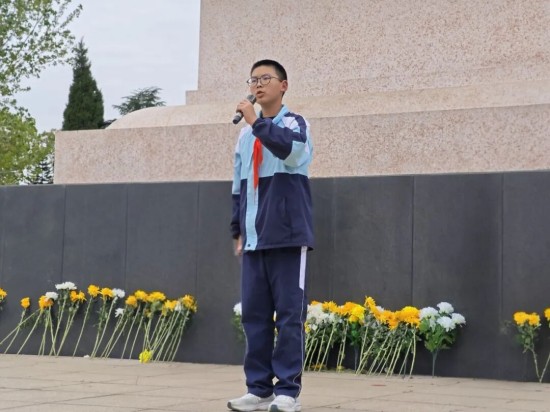 大队委大队长赵帅甫作为学生代表发出新时代少年的最强音。他带领优秀少先队员代表在烈士陵园庄严宣誓:铭记历史,缅怀先烈;努力学习,练就本领;锤炼品德,时刻准备着为共产主义事业奋斗!