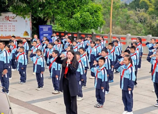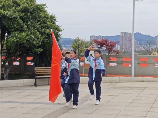 出旗仪式庄重而神圣,队旗在春风中作响,队歌嘹亮传四方,彰显着新时代少年的蓬勃朝气。