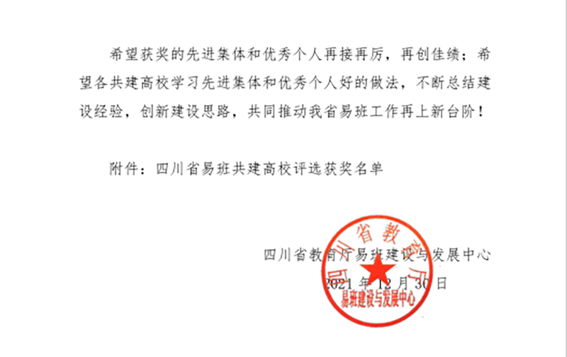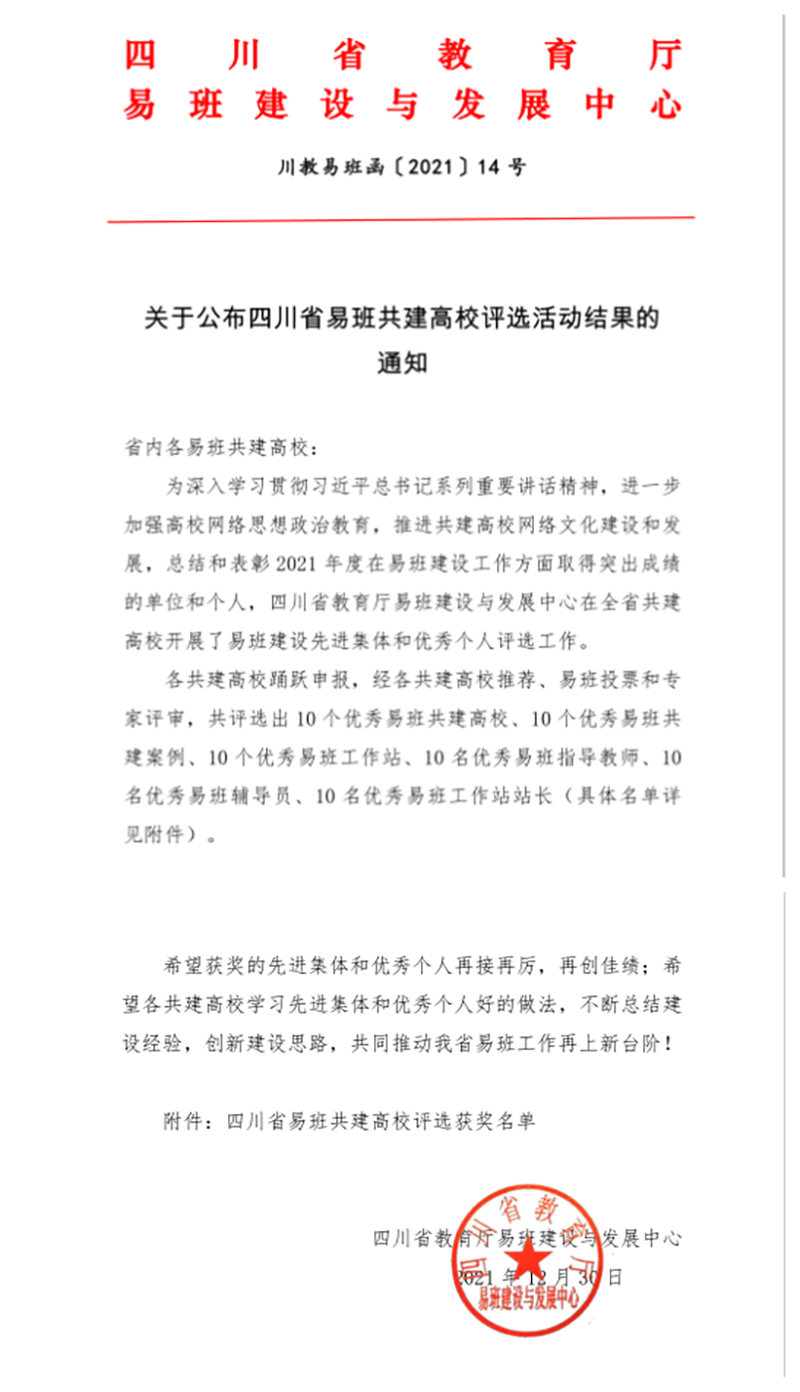 四川省教育厅自2015年开展易班建设以来,四川化工职业技术学院连续5次被评选为“四川省优秀易班共建高校”,2020年,被教育部评为“全国优秀易班共建高校”,先后有10余所高校来学校交流学习易班建设经验。在2021年四川省易班建设先进集体和优秀个人评选工作中,全省每所高校最多可申报6项,四川化工职业技术学院荣获5项大奖,是全省高职院校中获奖最多的学校。2021年,在四川化工职业技术学院党委的正确领导下,在相关部门的大力支持和密切配合下,四川化工职业技术学院易班工作始终围绕立德树人根本任务,聚焦思想引领,根据易班网络平台的特点及新时代高职学生的特点,将“易班”建设成为富有高职特色、化院特点、时代特征,集思政教育、教育教学、生活服务、文化娱乐为一体的高职大学生网络育人平台,有效地吸引学生、留住学生、引领学生,学校易班共建指数和活跃指数一直在全省易班共建高校中名列前茅。校方表示,学校将以此次获奖为新的起点,继续深入学习贯彻习近平总书记系列重要讲话精神,进一步加强网络思想政治教育,推进共建学校网络文化建设和发展,不断总结建设经验,创新建设思路,共同推动学校易班工作再上新台阶。