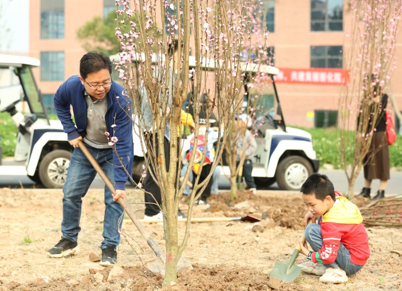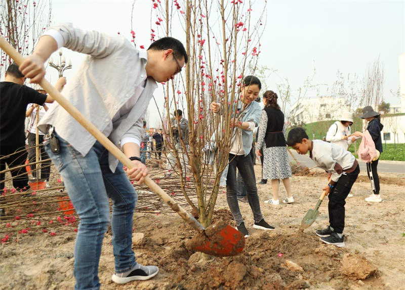 早晨9时许,学校工程实训中心旁的花园里呈现一派热火朝天的植树景象。现场师生员工及家属热情高涨、干劲十足,纷纷拿起铁锨、镢头,挖坑、扶苗、铲土,小朋友拿着铲子铲土的动作像模像样,和家长分工协作,配合默契。