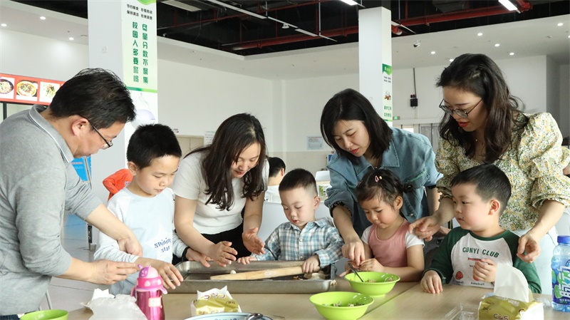 植完树,广大教职工及家属在学校教工餐厅迎来了一场别开生面的“童心童趣 同乐同行 快乐DIY 饺子亲情包”包饺子活动。餐厅的师傅们为大家准备了丰富新鲜的饺子馅,有韭菜肉馅、白菜肉馅、芹菜肉馅和玉米素菜馅。孩子们在家长的指导下,学着擀面皮、包饺子,做得有模有样。
