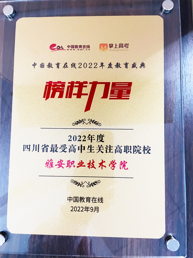 近日,中国教育在线“榜样力量·2022年度教育盛典”评选获奖名单揭晓,雅安职业技术学院荣获“2022年四川省最受高中生关注高职院校”荣誉称号。