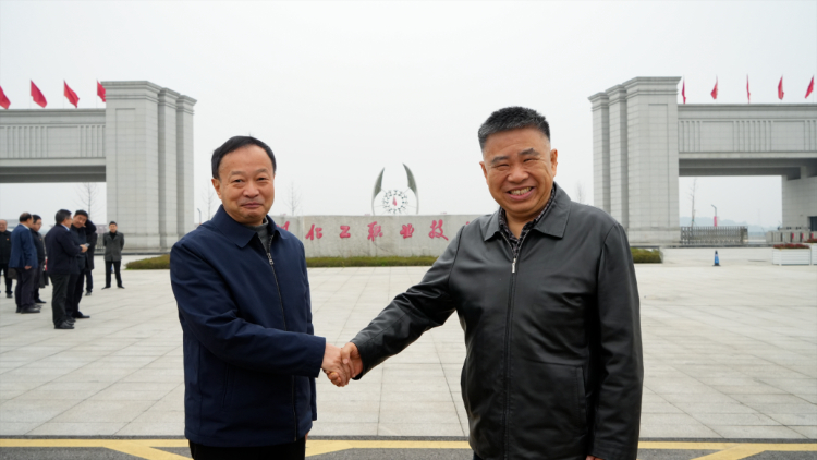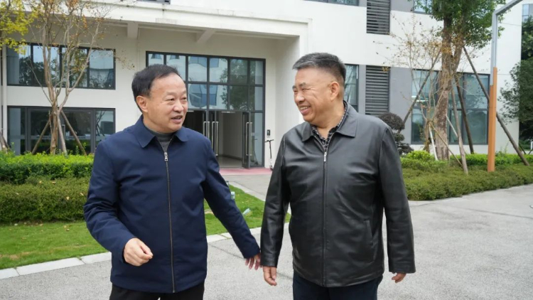 ▲四川化工职业技术学院党委书记刘志勇(左)陪同江阳城建职业学院理事长吴振华(右)参观学校