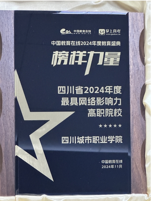 近日,中国教育在线“榜样力量·2024年度教育盛典”优秀案例公示。四川城市职业学院凭借极具创新性与前瞻性的招生宣传策略,以及扎实过硬的宣传执行实力,从众多高校中突围,获评四川省“2024年度最具网络影响力高职院校”。